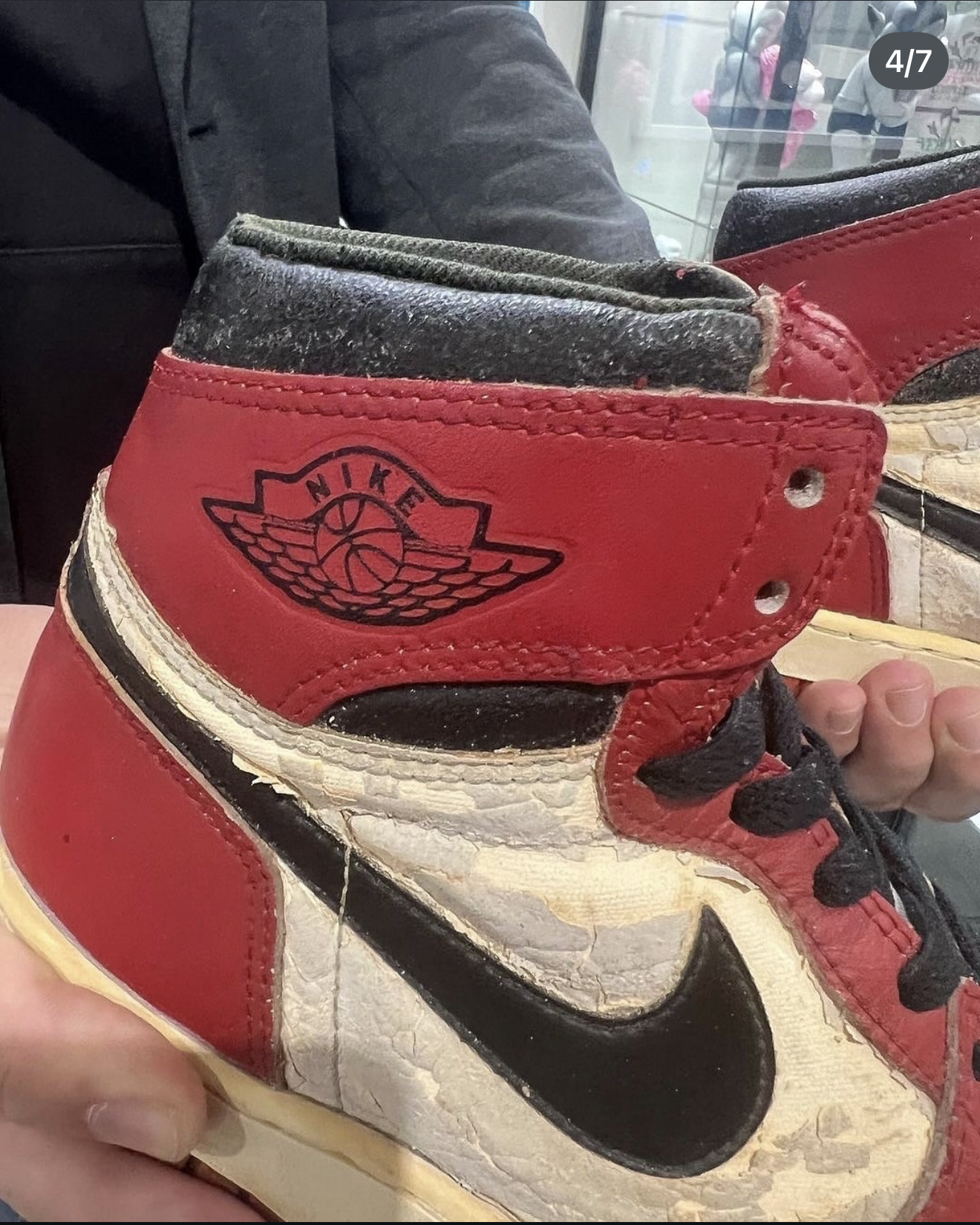 One of the most common signs of age on an original pair of AJ1s was a cracked and faded ankle collar. The black leather material wrapped around the ankle collars had a tendency to dry out and crack over a period of time, and often would begin to flake off with wear and handling.